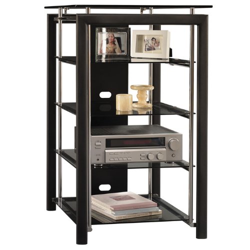 Bush Furniture Midnight Mist Collection audio tower is constructed of top quality engineered wood with a Black laminate finish.Audio tower features tempered glass shelves that rest on vibration dampening pads for enhanced sound quality, attractive open architecture, and an open back panel that provides rear wire access and concealment. Tested for tip stability with your safety in mind.Ships ready to assemble.