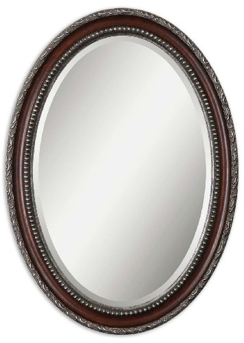 This gorgeous mirror has the appearance of a treasured heirloom piece with its oval shape and rich mahogany wood tone finish. Inner and outer edges of the frame are detailed in antiqued silver and a dark gray wash. Mirror glass has a generous 1 1/4" bevel. From Uttermost.