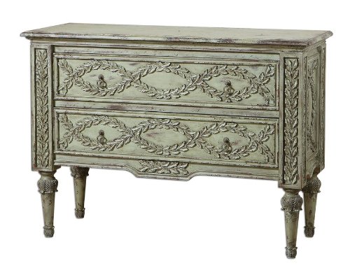Opulent carvings and generous storage in heavily distressed, spring moss green with auburn undertones. Two pull out drawers. Matching mirror is item #11916.Finish Light WoodStyle Rustic